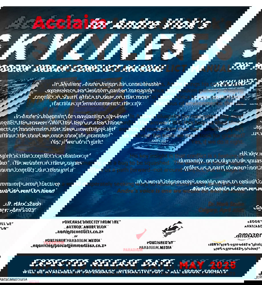 My third textbook is about to be published (May 2025). Paperback and all e-book formats, via Amazon, the publishers at enquiries@paradigmmediasa.co.za or myself directly at andre@conflict1.co.za